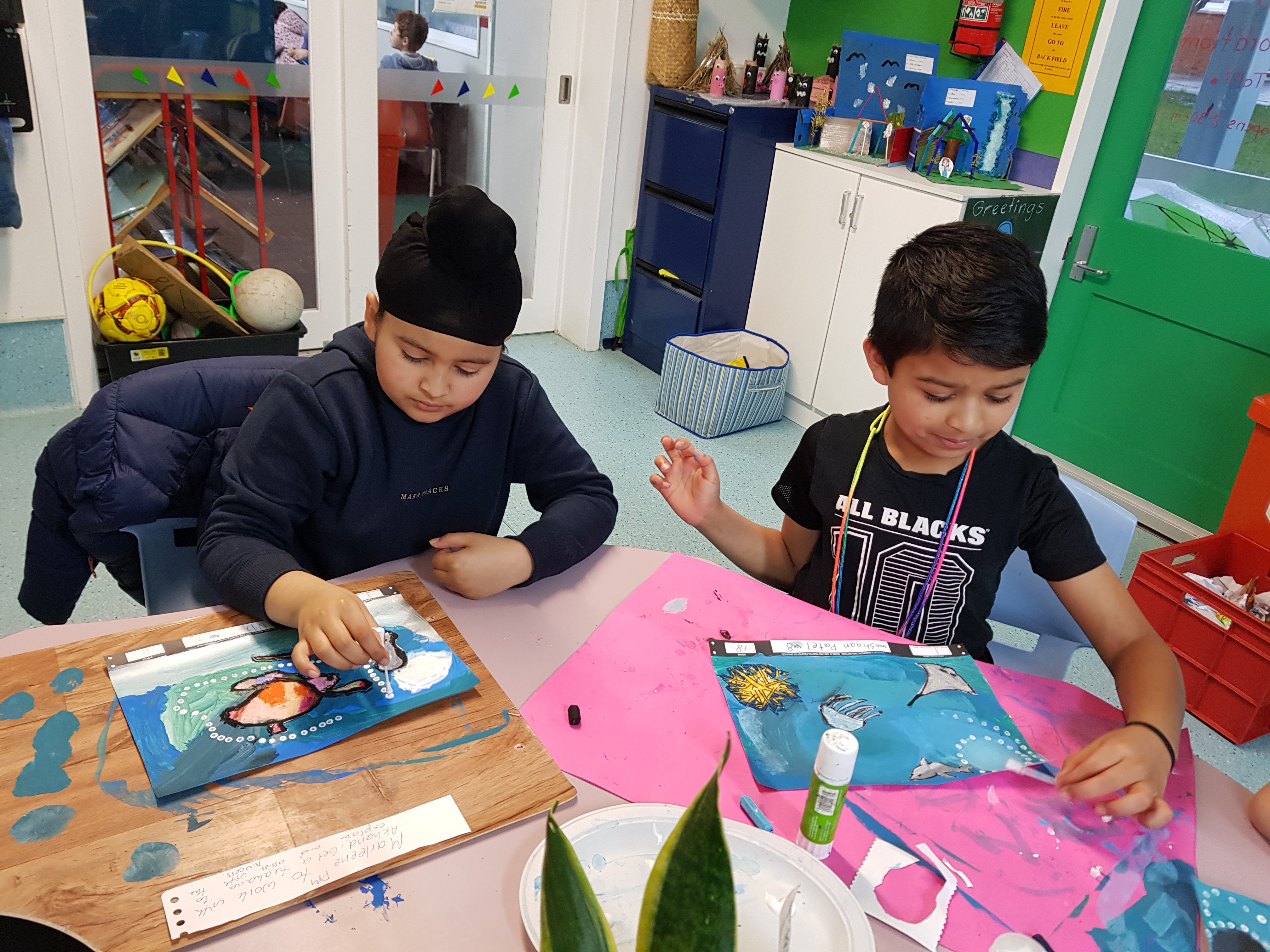 Back in the classroom, we were working on our Calendar Art 2021. It's all finished, hanging on the wall. I'm glad I took pictures of each one of them. This week, when we talked about the things we missed, the majority of the students missed their friends and Art Cafe. So here it is to brighten your day and put a smile on your face.  Our artworks are inspired by our learning about ecosystems.  In particular, the sea, rocky shores and the impact of plastic pollution.  We've learned about overfishing and its dangers to Maui dolphins.  We wrote about how some creatures like turtles mistake plastic bags for their food...We've investigated a real kina kina (sea urchin). Some groups read about coral bleaching and its effect on the ocean ecosystems, others read about sharks and other exciting sea creatures.  The children remembered the Kai Moana song from their kindy. In Room 18, we like reading Maori mythology, so we remembered the story of Ranginui and Papatuanuku. Tangaroa, their son and the guardian of the oceans, rivers and lakes inspires us to be the kaitiaki (guardians) of our planet Earth.  This art has the Australasian elements of the Aboriginal dot painting and Maori koru. Of course, the children loved these as bubbles..... One could think of the Australia-New Zealand bubble, the very reason we're learning from home now. When we get back to school the families will be able to purchase these artworks as calendars, diaries, postcards and more.  This year our art has a historical value...2021.
